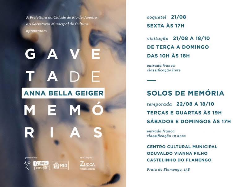 “Gaveta de Memórias” é a mais recente exposição individual de Anna Bella Geiger, que será aberta dia 21 de agosto, sexta-feira, às 17h no terceiro piso do Centro Cultural Oduvaldo Vianna Filho, mais conhecido como Castelinho do Flamengo. A exposição foi contemplada no Programa de Fomento à Cultura Carioca, da Secretaria Municipal de Cultura do Rio de Janeiro.
